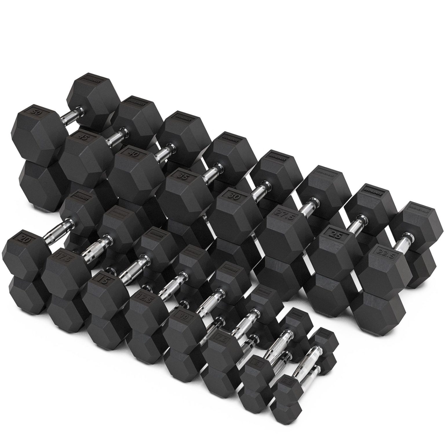 26 пар гантелей (1 кг, 2 кг, 3 кг, 4 кг, 5 кг, 6 кг, 7 кг, 8 кг, 9 кг, 10 кг, 12,5 кг, 15 кг, 17,5 кг, 20 кг, 22,5 кг, 25 кг, 27,5 кг, 30 кг, 32,5 кг, 35 кг, 37,5 кг, 40 кг, 42,5 кг, 45 кг, 47,5 кг, 50 кг) |